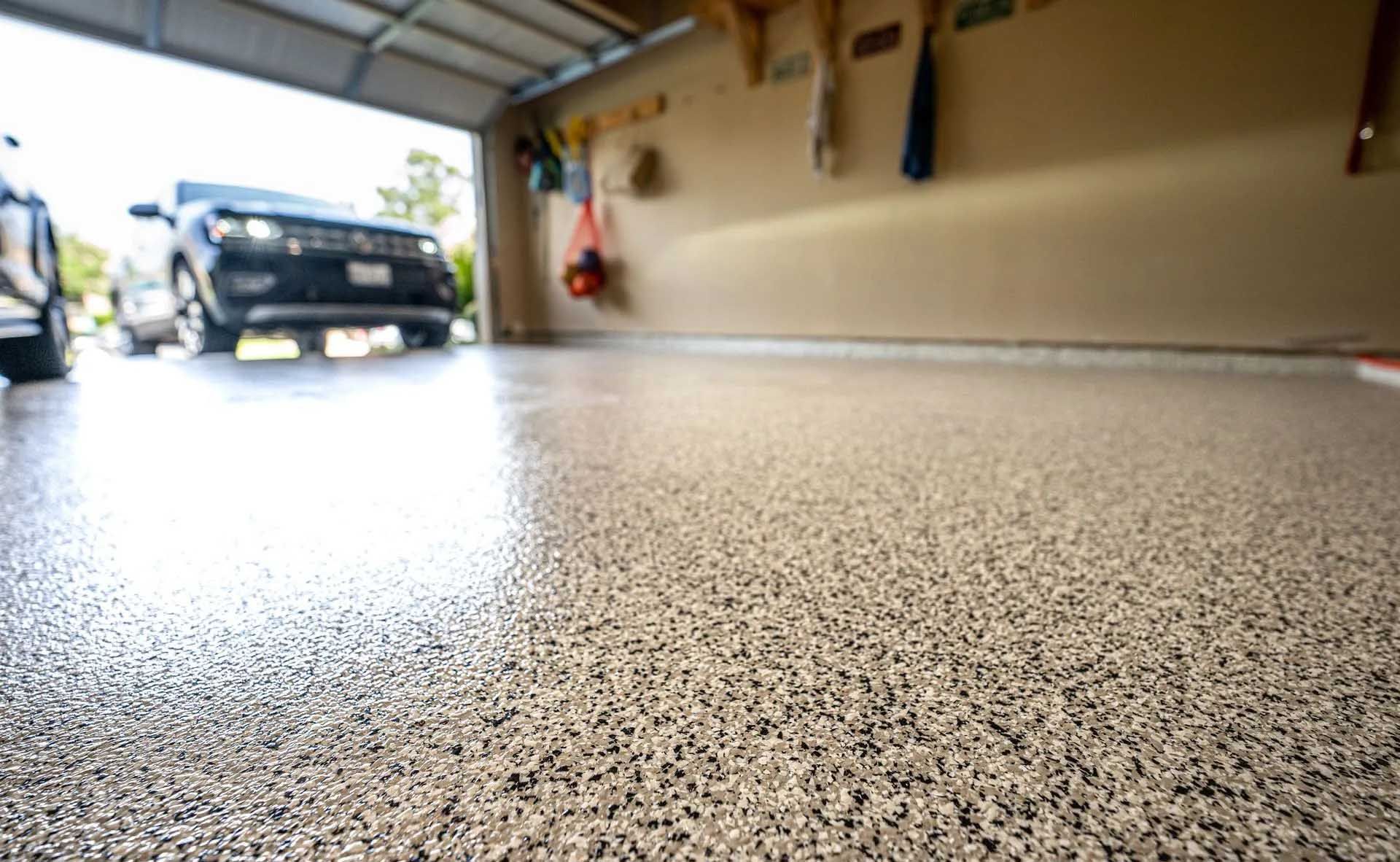 Les flocons de vinyle de DUPOXY créent une texture décorative qui cache les défauts du béton et garantissent une surface antidérapante, offrant une combinaison de sécurité et d'esthétique.